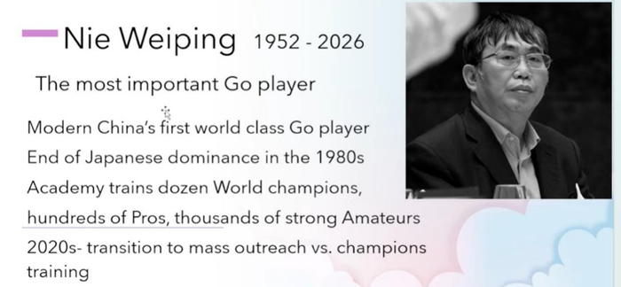 中国围棋大师聂卫平于 2026 年 1 月 14 日仙逝,享年 73 岁。聂卫平先生在 20 世纪 80 年代的胜利帮助围棋在中国彻底复兴,并使中国重新成为世界围棋强国。